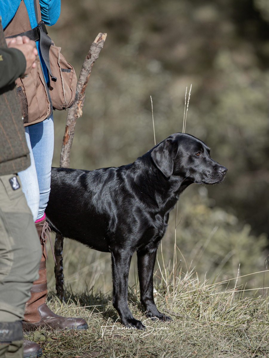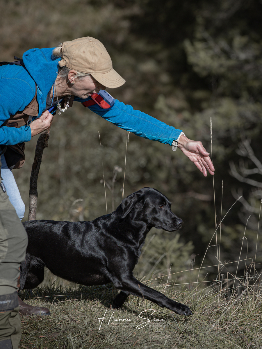 Carly hatte als Nummer 1 eine echt kniffelige Aufgabe zu meistern. Die 1. Markierung fiel links in den Hang. Dann fiel eine rechts, aber hinter große Tannen. In der Schneise, wo die Hunde durch mussten, waren Verleit-Dummys. 1. Teil: 1 Blind eher in der Senke, das war o.k. nicht perfekt, dann die Markierung. Au Mann, sie war immer dran an den Verleit-Dummys und ich bekam sie davon weg. Anette lobte den braven Hund.